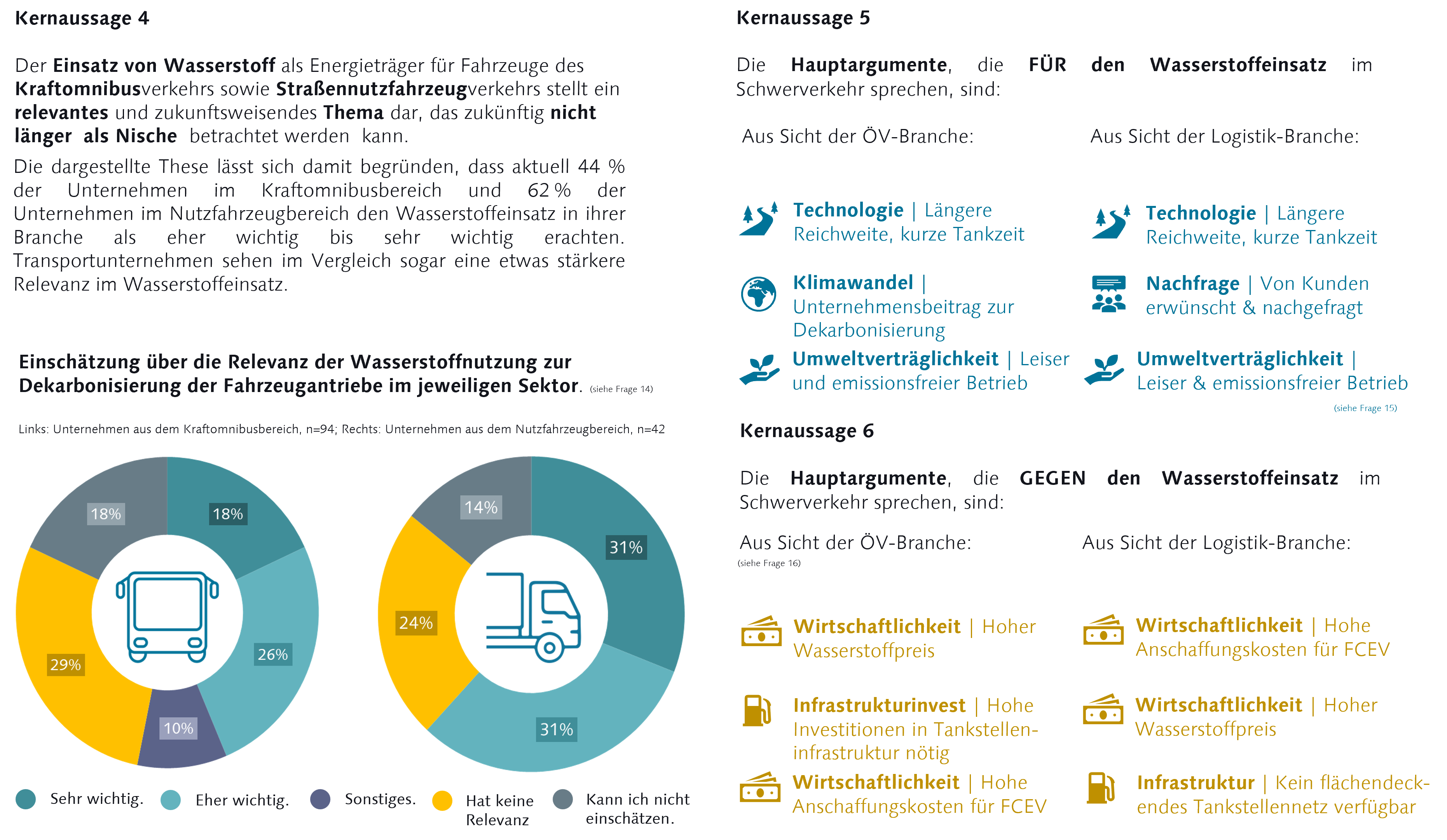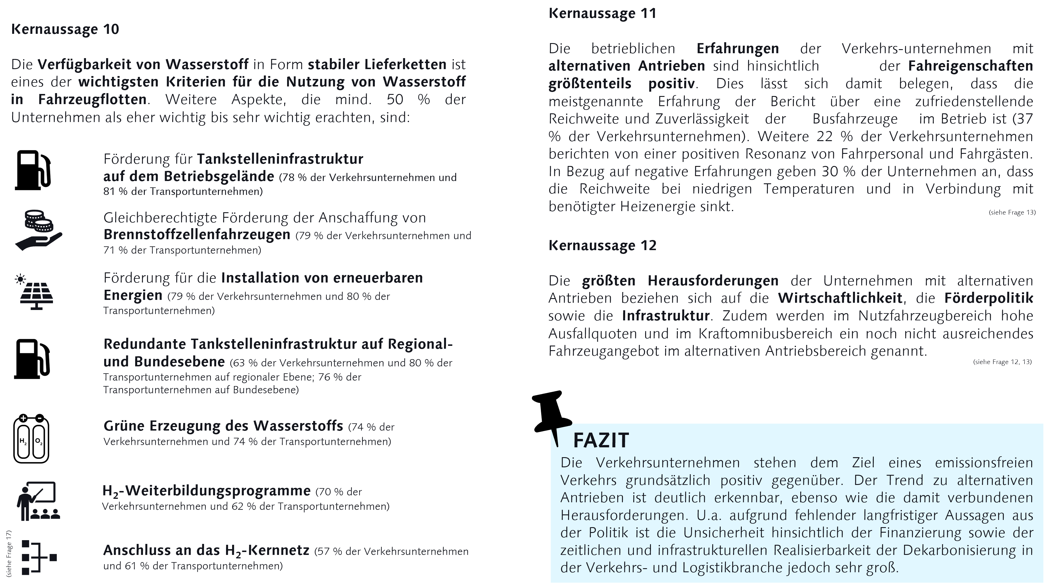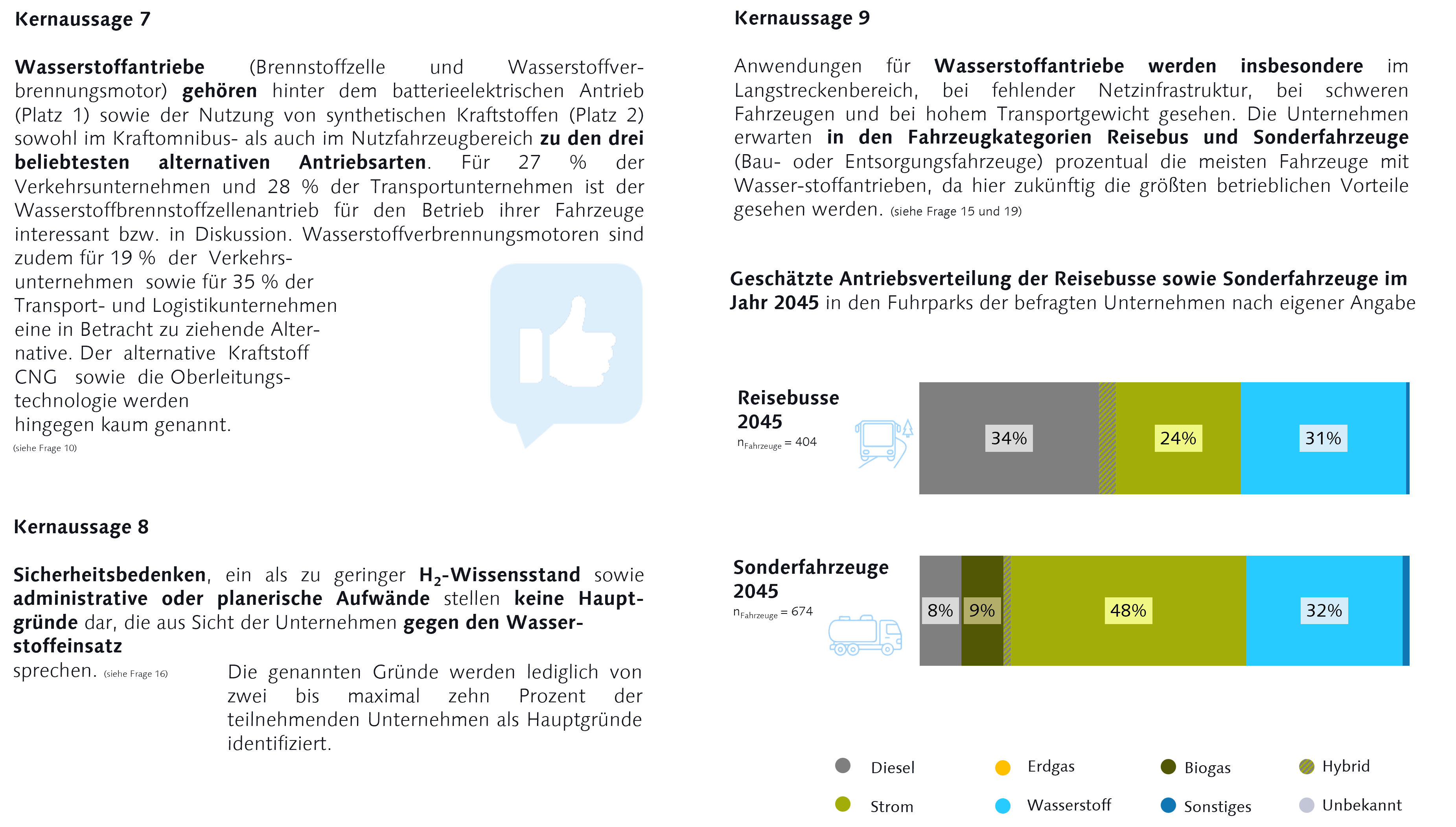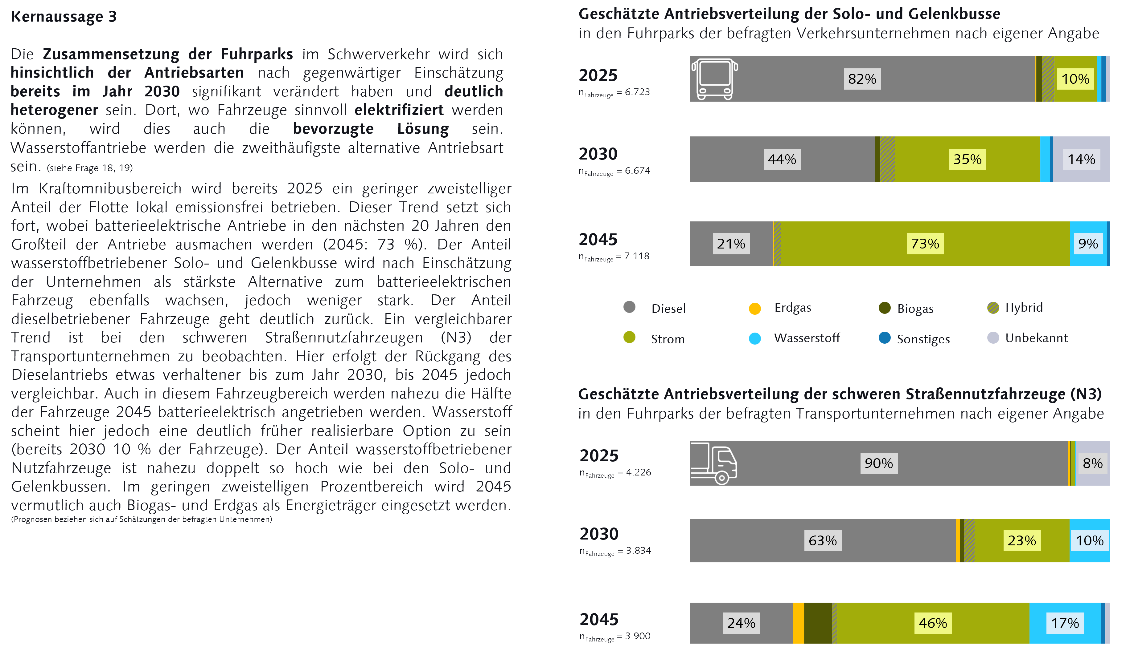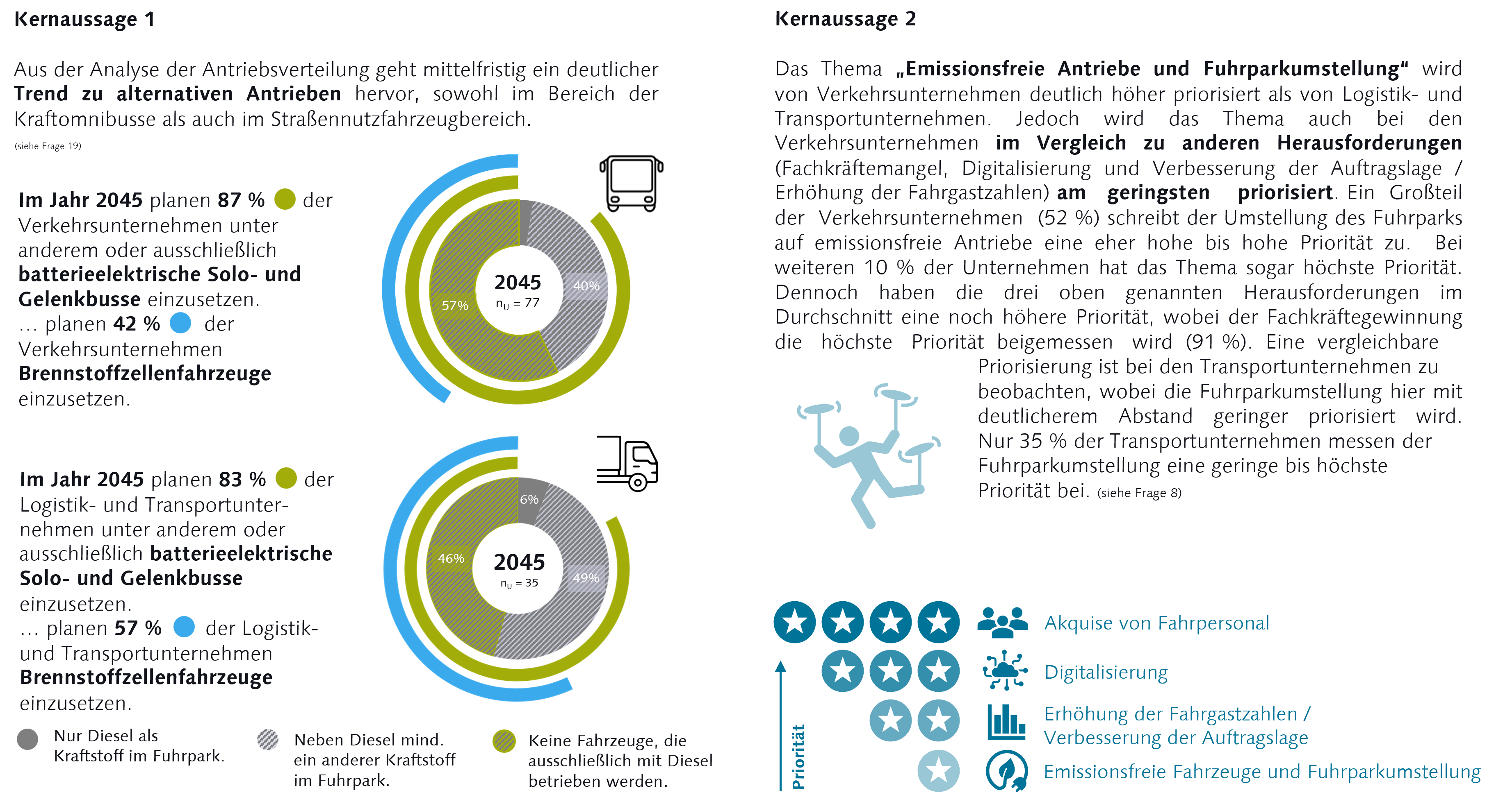 INFO ! Die folgenden Infografiken stammen aus der von der Bauhaus-Universität Weimar durchgeführten Studie "Antriebswende im Schwerverkehr - Bundesweite Umfrage zu Kraftomnibussen und Straßennutzfahrzeugen in Deutschland 2025". Die Ergebnisse basieren auf den Antworten von bundesweit vorrangig mittleren und großen Unternehmen (99 Verkehrsbetrieben und 44 Transportunternehmen aus den Bereichen Logistik und Bauwesen). Bezogen auf die Anzahl der Fahrzeuge repräsentieren die Aussagen zur Entwicklung des Fuhrparks 8.475 Kraftomnibusse (10 % des bundesweiten Bestands an Kraftomnibussen) und 6.074 Straßennutzfahrzeuge (rund 1 % des bundesweiten schweren Nutzfahrzeugbestands).