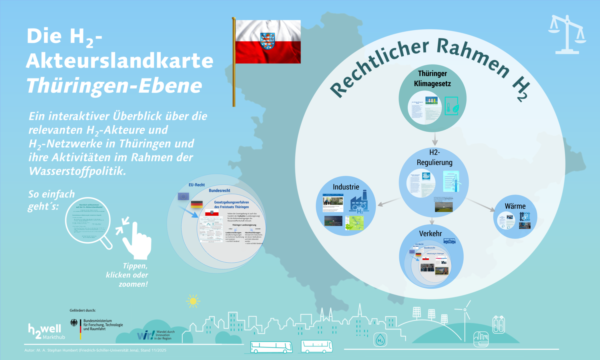 Welche Rahmenbedingungen gelten für die Wasserstoffwirtschaft? Die interaktiven Infografiken zeigen die wichtigsten Rechtlichen Rahmenbedingungen auf EU-, Bundes- und Landesebene (Thüringen). Ob Sie neu in der Branche sind oder einen Überblick über relevanten Gesetze suchen – hier finden Sie auf einen Blick, welche Gesetze, Richtlinien und Strategien es gibt und wie sie zusammenwirken. Entdecken Sie die Inhalte auf Ihre eigene Weise und vertiefen Sie die Themen je nach Interesse durch Zoomen und Klicken.